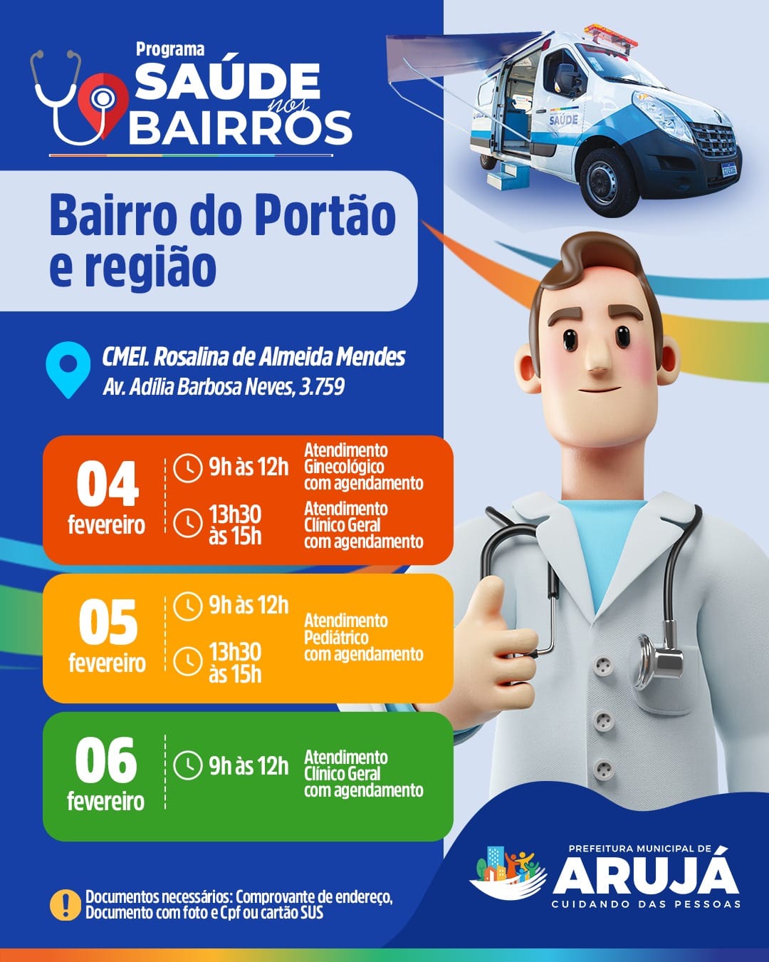 A Prefeitura de Arujá, por meio das equipes da Saúde, continua com o Programa Municipal “Saúde nos Bairros”, que atenderá os moradores do bairro do Portão e arredores entre os dias 4 e 6 deste mês.