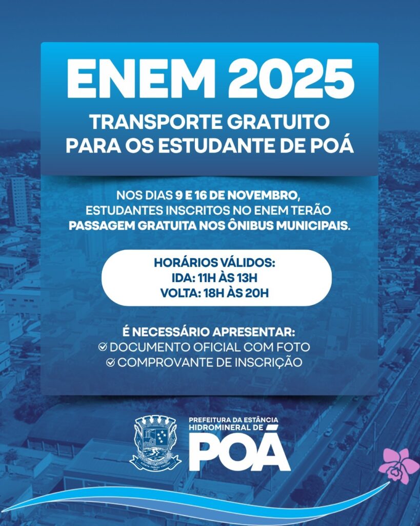 O secretário de Educação de Poá, Diego Moreira, destacou a importância da iniciativa para garantir a participação de todos os inscritos no exame. “O Enem é uma das principais portas de entrada para o ensino superior no Brasil, sendo determinante para o futuro profissional de milhões de estudantes. Assegurar o transporte gratuito não é apenas uma medida de apoio, mas um ato de justiça social com aqueles que não têm condições de arcar com o valor da passagem”, afirmou.
