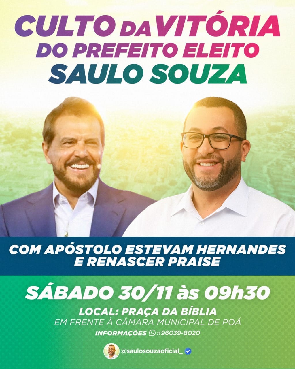 O prefeito eleito de Poá, Saulo Souza (PP), irá celebrar o primeiro lugar na eleição municipal com o “Culto da Vitória”, que ocorrerá no próximo sábado (30), na Praça da Bíblia, com as presenças do apóstolo Estevam Hernandes e do grupo gospel Renascer Praise. O evento, que é aberto ao público e contará com ponto de inclusão, será um momento de agradecimento juntamente com a população pelo resultado nas urnas em 6 de outubro.